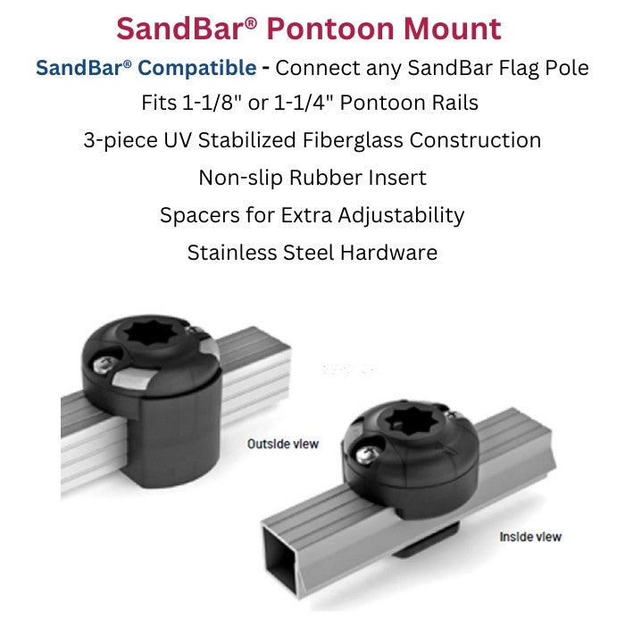 The Pontoon Mount fits perfectly on 1 - 1/8 or 1 - 1/4 square rails commonly found on all pontoon boats. The pontoon mount also includes 2 spacers to create a perfect fit if needed.